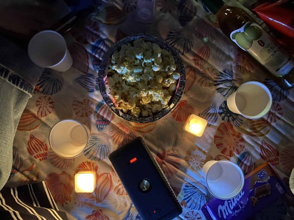 - 結束熱湯後, 我們圍坐在野餐墊上, 點起蠟燭放著歌, 一人披上一件毯子小酌對抗寒冷的夜晚