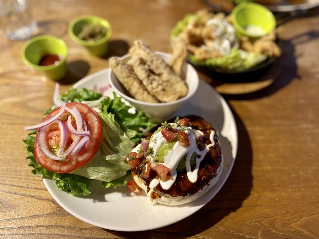 - 墨西哥辣味酪梨沙拉牛肉堡 $328, 付餐選 炸野菇